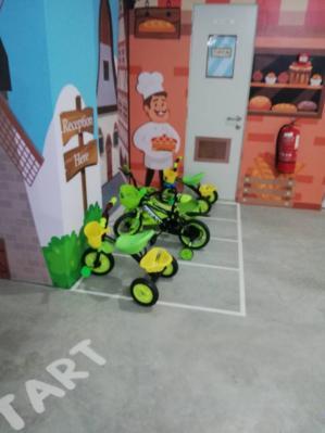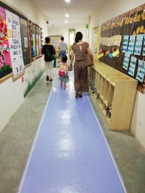 幼稚園の中に入ると、カラフルで、可愛い教室のデザインがまず目に入ってきました。子どもたちの目に触れるため、周りに飾っているものは鮮やかな色をしています。更によく見ると、遊具もいくつかありました。教室の廊下に車線が描かれていて、子供用の自転車も3-4台用意されていて、子供たちは車線に沿って自転車に乗っていきます。この遊びを通して道路を走る際、または渡る際のマナーやルールについて学ぶことができますので、非常に教育的だと思います。幼稚園なので、学校に比べると施設はそれほど多くありませんが、子供たちにとっては十分楽しめると思います。