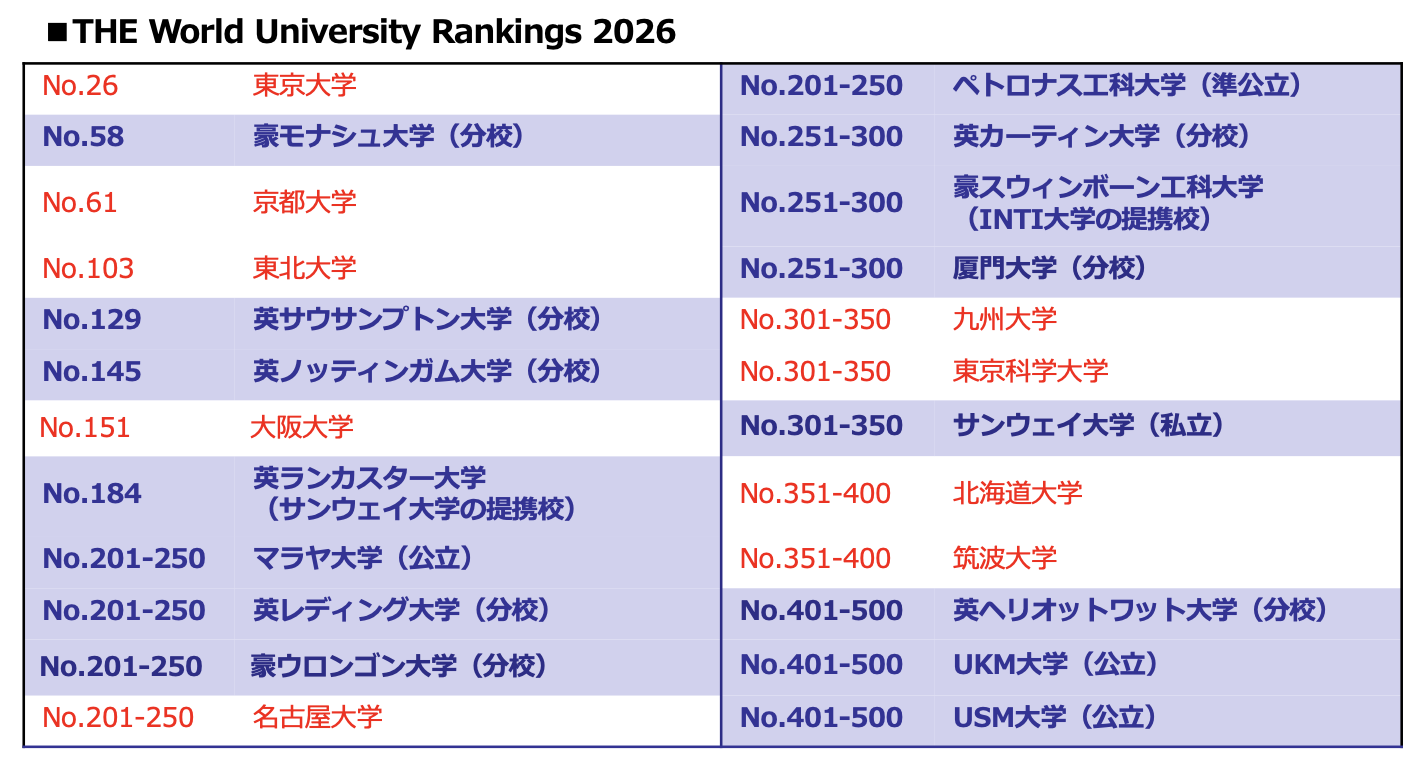 タイムズランキングでは、欧米の大学や、規模が大きく歴史の長い大学が選定される傾向があるため、マレーシア、日本の大学とも、特に私立大学はランクインするのが難しくなっている様です。