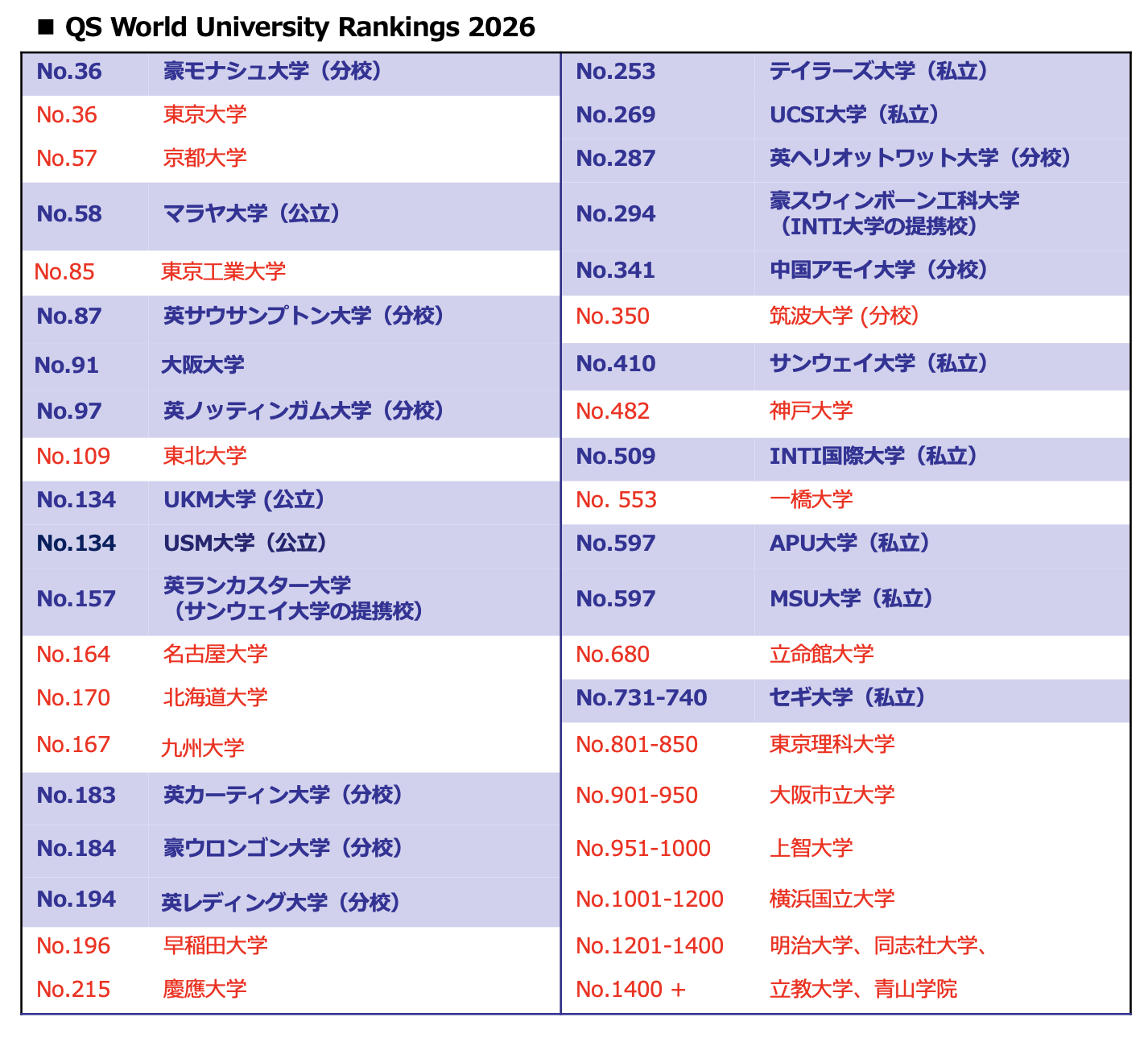 | マラヤ大学(UM) | 60位 | 251-300位 |