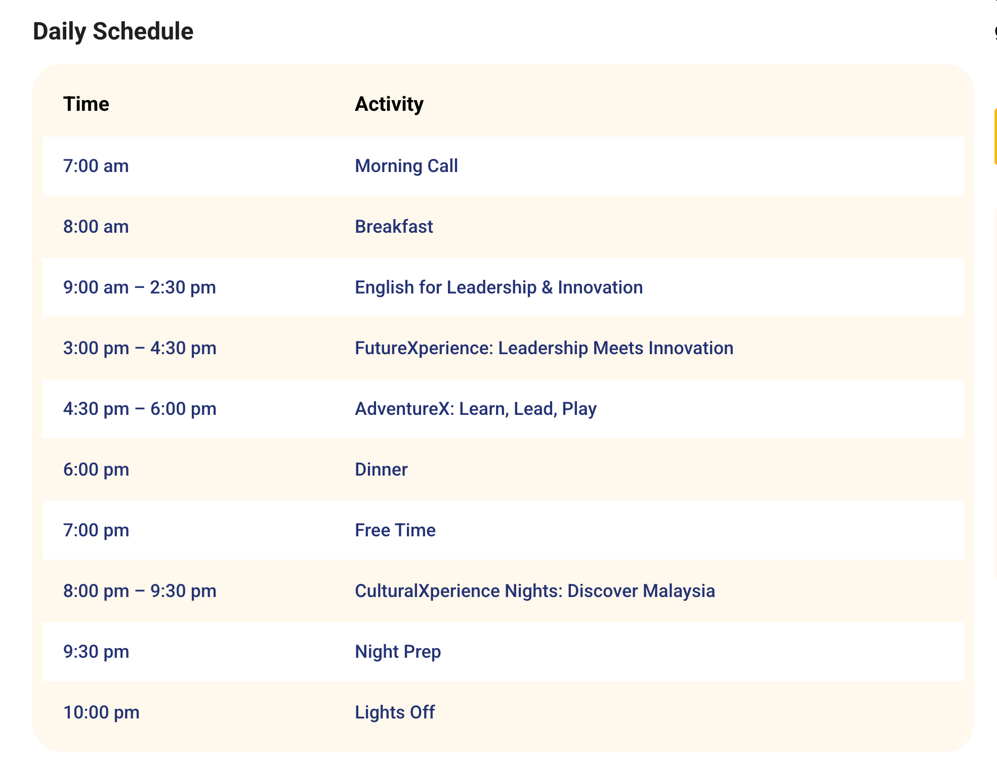 毎日、創作プロジェクト、ロボティクス、リーダーシップチャレンジ、スポーツ、文化体験など、専門スタッフが指導する多彩な活動が行われます。